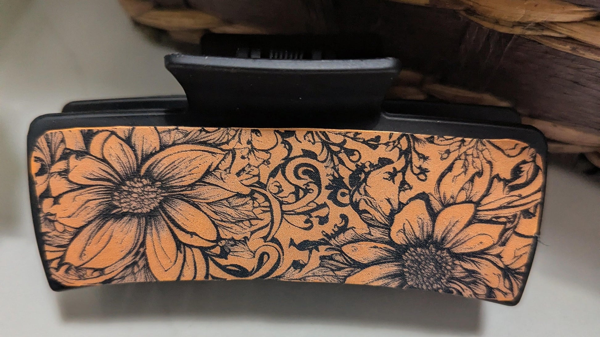 Large hair clip with leatherette soft floral design. 4.1 inches. Strong grip to hold hair securely. Two colors to choose from.