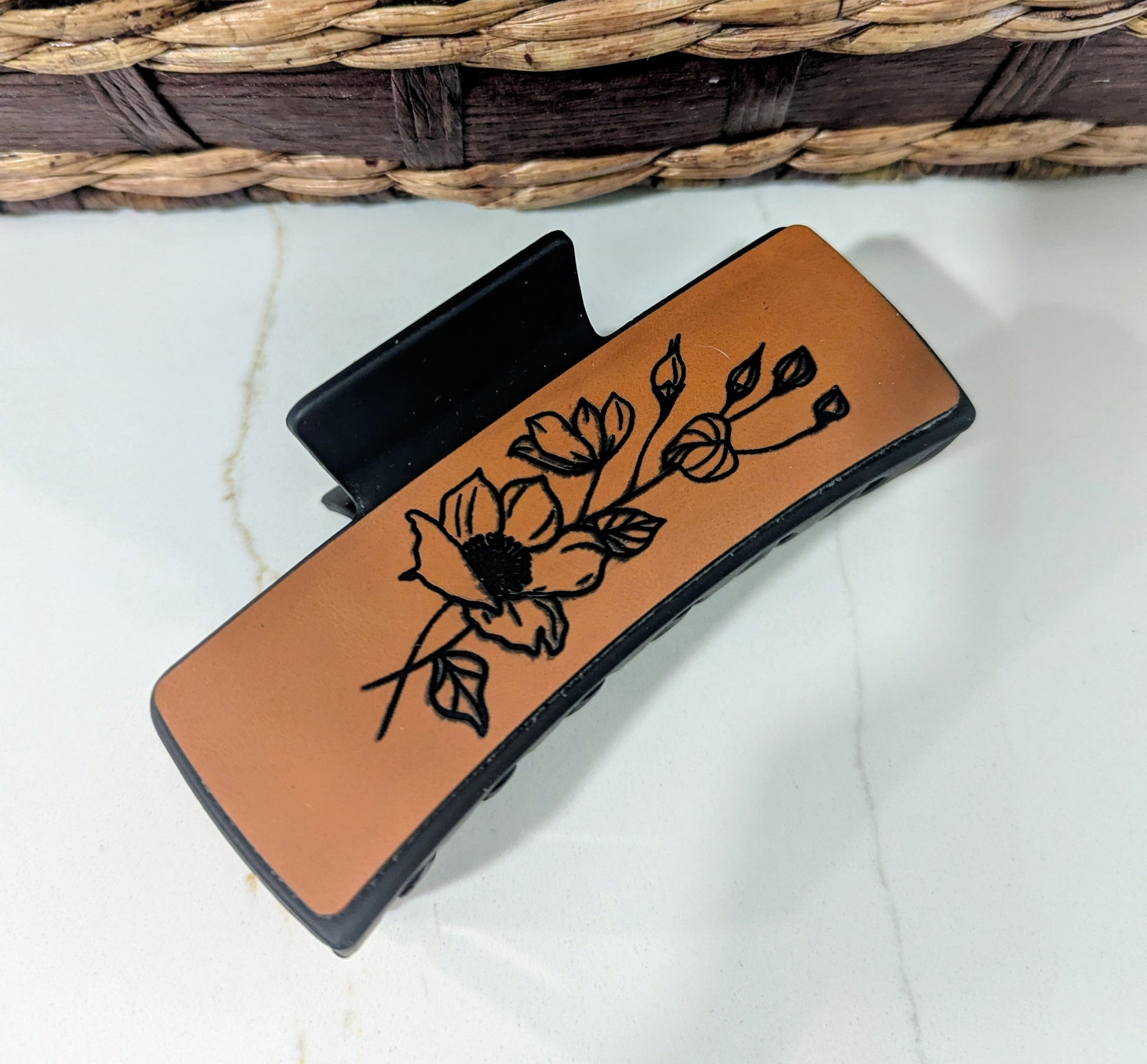 4.1 inch Black Hair clip. Leatherette etched wild rose. Large clip holds hair securely. Two colors to choose from.