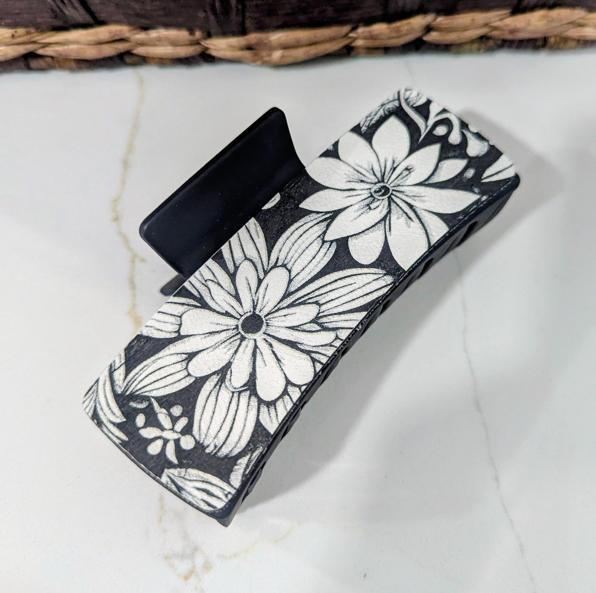 Large black hair clip with leatherette paper cut floral design. 4.1 inches. Strong grip to hold hair securely. Two colors to choose from.